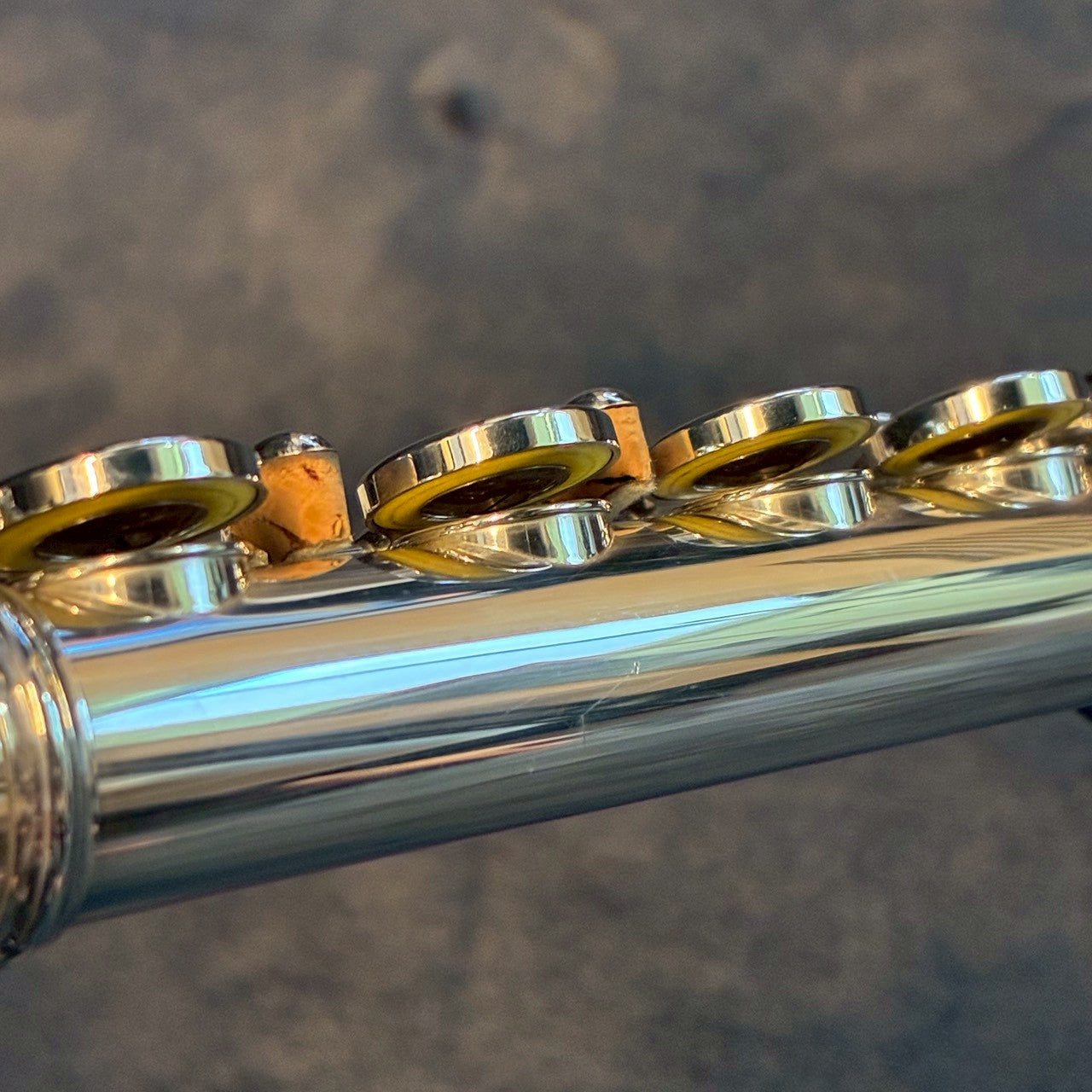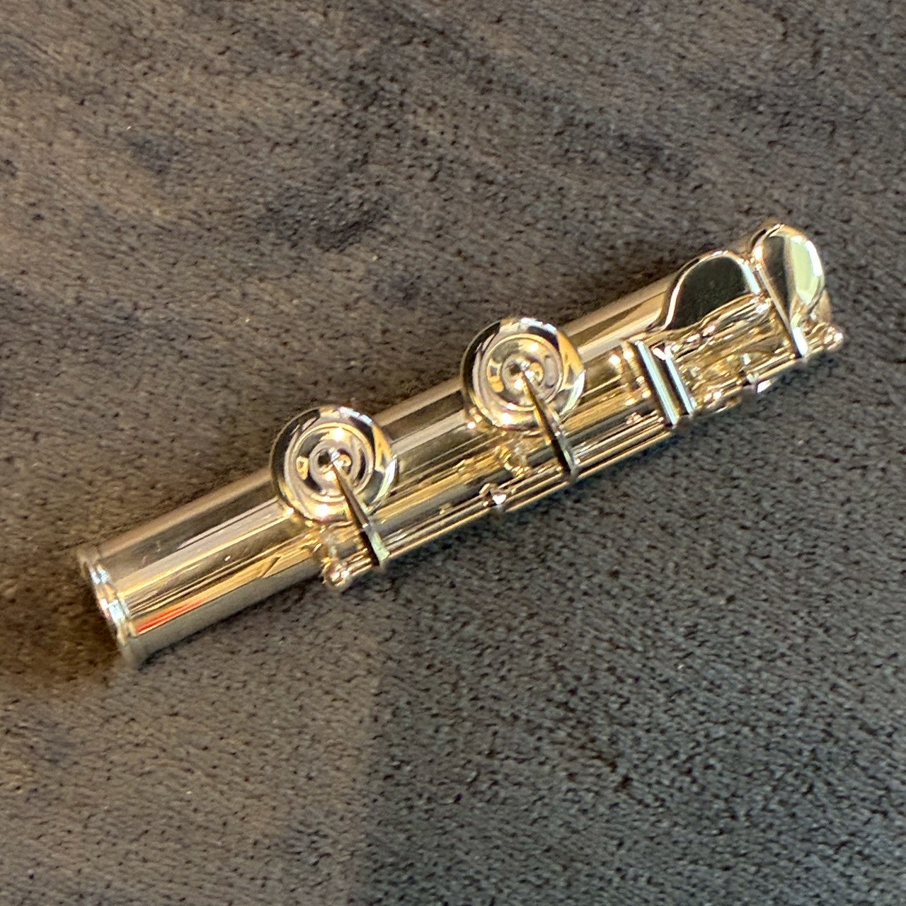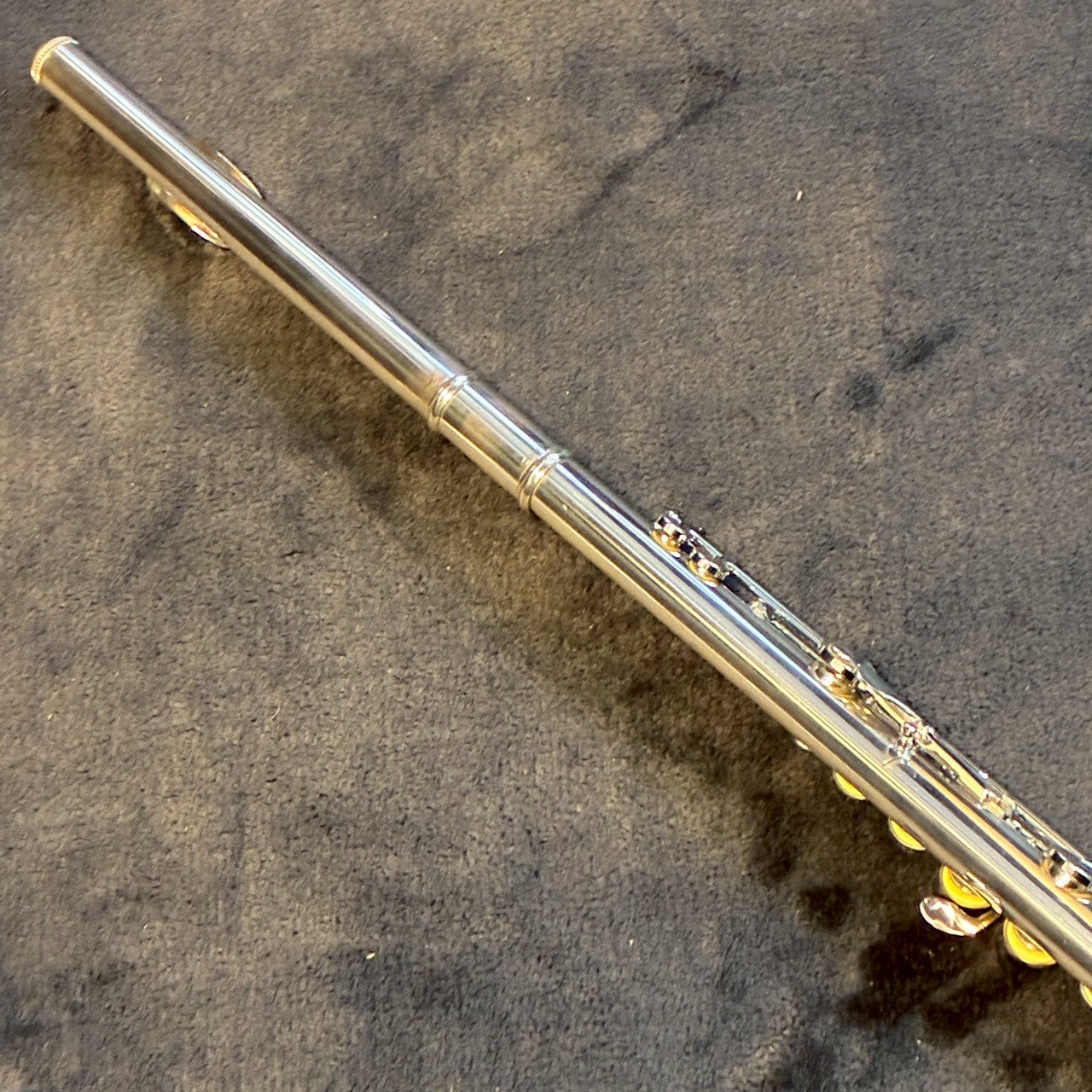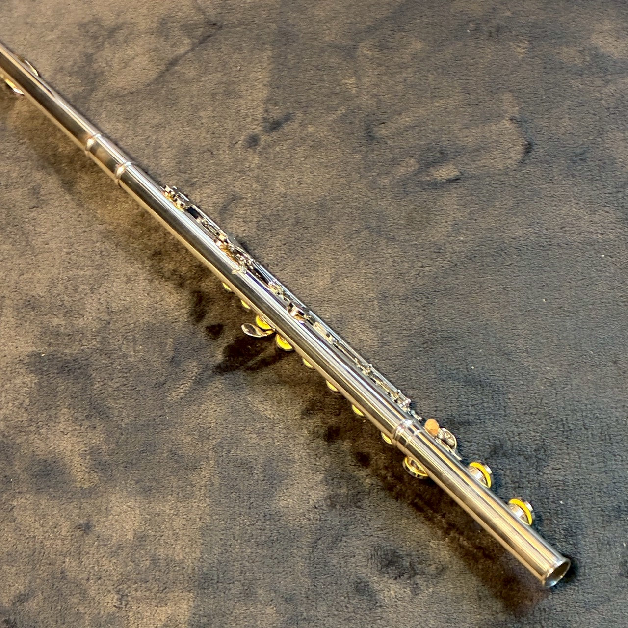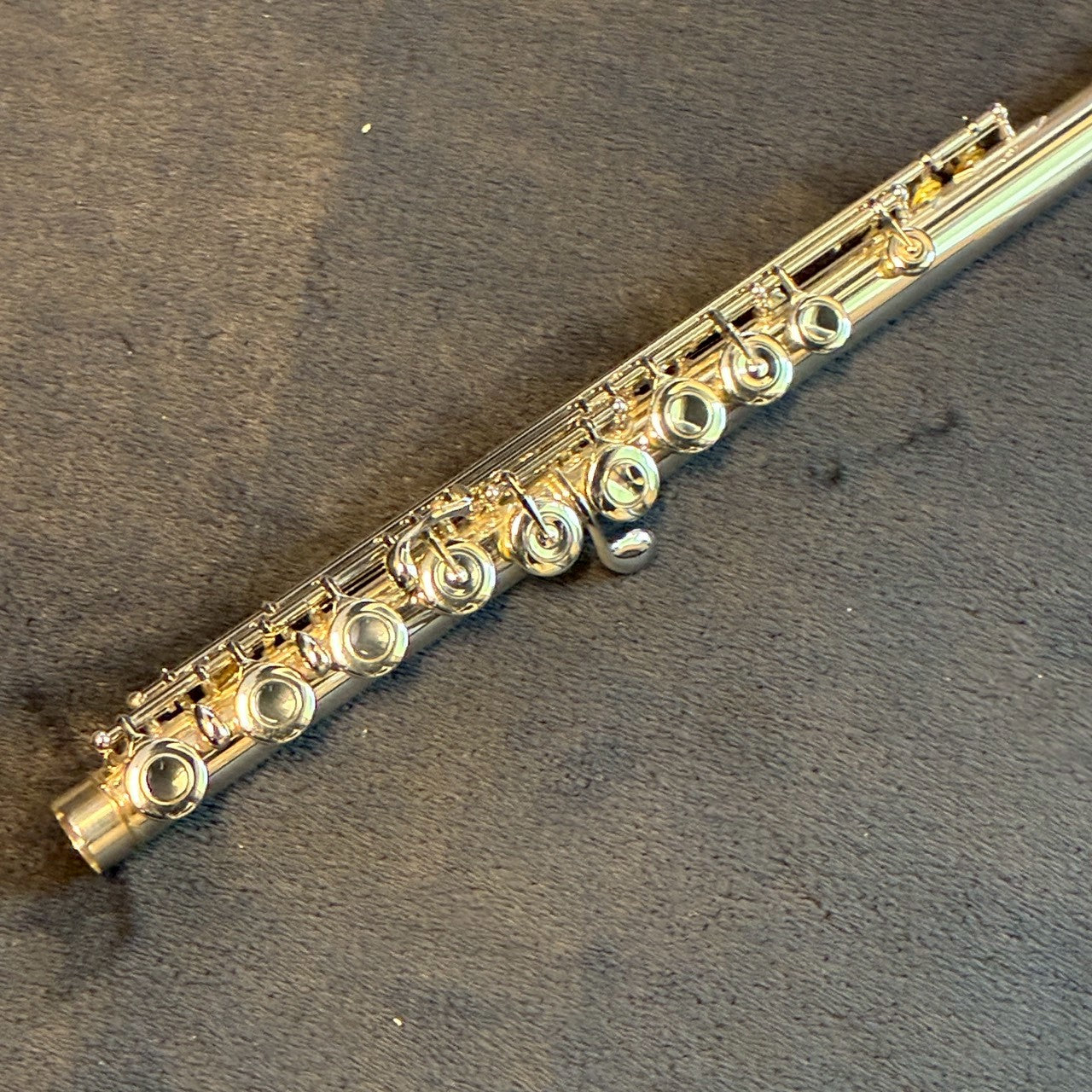 洋銀製のキィ・メカニズムを、スターリング・シルバー(Ag. 925)の管体(+座金・ポスト)が支える、ユニークな構成のフルートです。