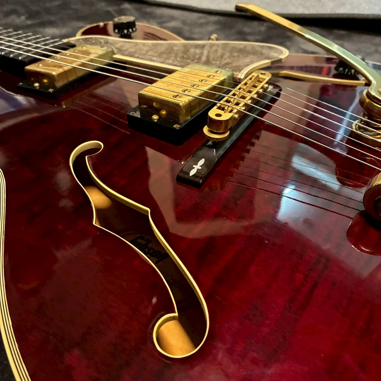 フレイムメイプル材を採用した17インチのシンライン・アーチトップボディとmaster vol, vol,と独立した二つのツマミ、サムネイルインレイなどGretchの名残も感じさせながらエルボーガードなど97年製独自のプロポーションも持ち合わせています。