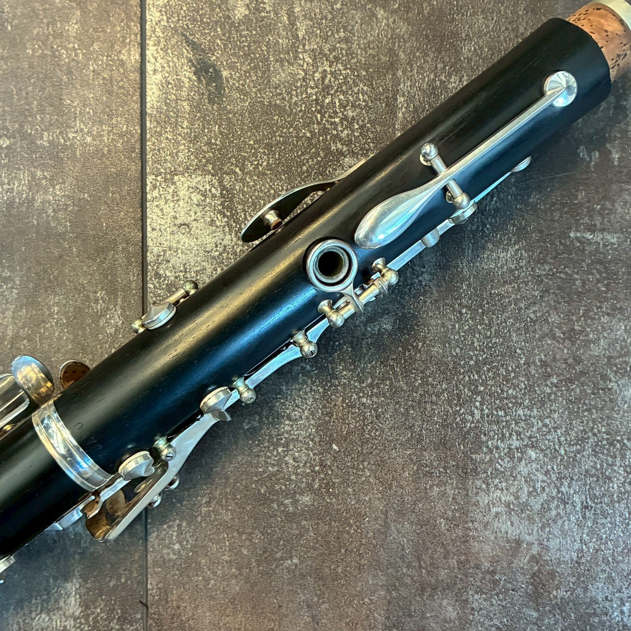カスタムSEシリーズB♭管。管体はグラナディラ、キイは洋白鍛造銀メッキ、芯金・ネジ類はステンレススチール、針バネ・板バネは硬質鋼、17キイ6リング・ベーム式・ジョイントリング付きモデル。